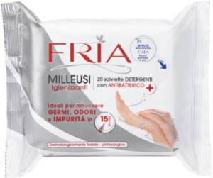 Ma quando l’acqua non c’è, come si fà ? FRIA ci ha pensato, creando per noi FRIA MILLEUSI igienizzanti, ideali per rimuovere GERMI, ODORI, IMPURITA’. 20 salviettine detergenti con antibatterico dalla formulazione dermatologicamente e oftalmologicamente testata presso il Centro di Cosmetologia dell’Università di Ferrara.