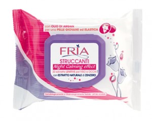 Novità  in casa FRIA: le nuovissime salviette FRIA STRUCCANTI Night Calming effect sono state appositamente studiate per struccare delicatamente tutta la superficie del viso, ponendo particolare attenzione a zone più sensibili come il contorno occhi in cui, a causa dello stress giornaliero dovuto alla stanchezza ed agli effetti dell’inquinamento ambientale, la pelle si puಠpresentare stanca e irritata. Grazie al tessuto in Puro Cotone e Fibre Naturali, le salviette effettuano un delicato massaggio del viso favorendo il rilascio dei principi attivi della formulazione e donando una gradevole sensazione di relax, soprattutto a fine giornata, nel momento si deterge la pelle e ci si prepara al riposo notturno. Grazie alle nuove FRIA STRUCCANTI Night Calming effect al termine della giornata anche le pelli più sensibili potranno beneficiare di maggior idratazione ed elasticità .