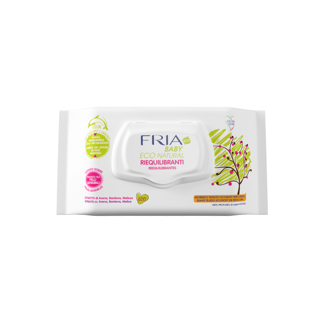 DELICADEZA PARA LOS NIÑOS Y RESPETO AL MEDIO AMBIENTE Fragancia de origen 100% natural de tela biodegradable, 99,4% del total de origen natural. El 6% del total de ingredientes son productos de agricultura ecológica. Las nuevas toallitas FRIA BABY ECO NATURAL, fabricadas en suave y resistente TEJIDO 100% BIODEGRADABLE, realizan una completa y delicada acción higiénica sobre la epidermis testada en sujetos con piel sensible. La acción suavizante de la especial formulación enriquecida con EXTRACTO DE FLOR DE NARANJO y productos de ALOE VERA de cultivo ecológico, confiere un efecto refrescante a la piel sin alterar su pH fisiológico natural. Prácticos y útiles en cualquier momento del día, han sido diseñados para la higiene segura de los recién nacidos y en total respeto por el medio ambiente. Probado en pieles sensibles. ESTE PRODUCTO ESTÁ HECHO CON ENERGÍA 100% RENOVABLE.
